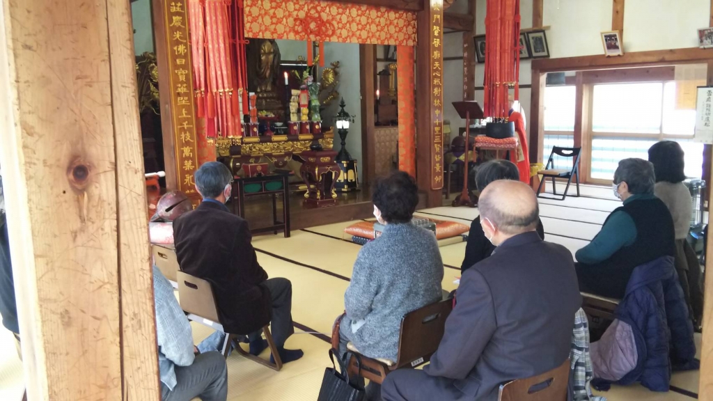 本日達磨忌を行いました。 ぽかぽかしたお参り日和、降雪の年もあるのでなんだか不思議な感覚でした。 自由参拝の形を取りました。 お焼香いただいたのは10数名でした。 感染症対策について、浸透しつつあります。 今年初めての呈茶。静岡の抹茶とシャロン甘洋堂さんのお菓子を。雪囲いを表した一品です。 感染症対策のため、風情がないのですが、容器のまま給仕させていただきました。 もう一品の菓子は、大輪菊...