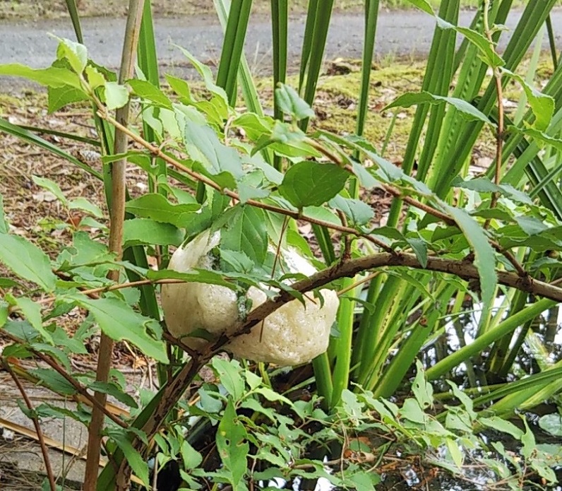 JUGEMテーマ:季節の出来事 とあるところで、モリアオガエルの卵を見つけました。 テレビなんかで見たことはありますが、実物を見るのは初めてです。 本当に泡に包まれているのですね。 下にいる大きなカエルがモリアオガエルの大人? もっと小さいアマガエルくらいのカエルなのかと思っていましたが、結構大きなカエルなのですね。