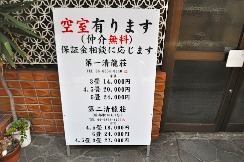 JUGEMテーマ:街の散策歩いていて見つけた看板。「ホテルの宿泊費?」と一瞬思うくらい安い!1ヶ月14000円だと1日約470円。安いなぁ。何部屋あるのか解りませんが大家さんの家賃収入は少ないのでしょうね。 ちなみに場所は大阪です。