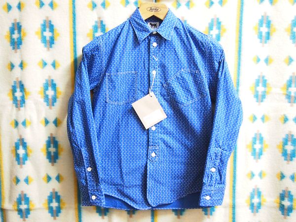 何しろ柄が特徴的な春夏物の新作シャツ 名前の通りのスター&ストライプ プリントではなくもちろん抜染で作製 オリジナルのハギレから起こしたそうな もう一つ特徴的なのがポケットですね アメリカ西海岸のワークウェアブランド 「BLACK BEAR」を参考に懐中時計を入れるために斜めでペン刺しが付いた 本来はカバーオールの左胸ポケットに使われていたものを ワークシャツ用にバランスを変えて転用しています その懐中時計を引っ掛けるループも付けられています ボタンにもこ...