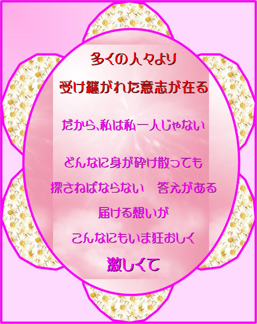 自分にできること 最後の最後まで貫き通してみよう選ばれた方法はひとつだけだよ自分の限界を抜き去って ひとつの答えを取るときですいつだってつよくなって、前へ向かって行くことが出来るよ無理に強くなろうって、おもわなくていいんだよ。人間は皆そう “次に進んでゆけたあなた”は素晴らしいの。いつも心からありがとう。多くの日々を繰り越えて そうしてまたあたらしい“あなたらしいあなた” になってゆけばいいんじゃないのかな?とにもかくにも 次に進んでゆく “熱意”それだけを持ちぬいて 風を切り裂こういま...