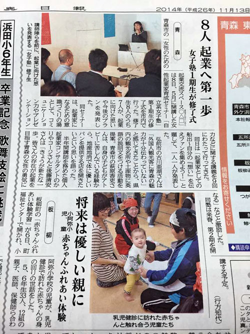 ビズフリ―ランス代表のかりやコージです。 先週末に開催した青森市での女性起業家支援のための「自立系女子塾」 の修了式について新聞に掲載頂きました。 東奥日報 2014年11月13日朝刊 彼女たちの今後のステップアップに、また、青森市で起業を目指す 女性起業家の卵の人たちの勇気づけになれば嬉しいですね! 第1期生はもちろんのこと、来年春からの第2期生も、全力でサポート して行きます。 なお、この「女子塾」のプログラムについて、東京でも問い合わせを 頂いており、渋谷での開催もビジネスパートナー...