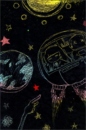 マリは小さな丸い宇宙船で宇宙を漂っていました。 しばらくはゆっくり星々を眺めていましたが 突然、宇宙船の調子が悪くなり、出入り口の扉の金具が緩んで扉が開いてしまいました。 一緒に乗っていた宇宙飛行士は扉から宇宙に放り出されてしまって マリは慌てて息を止め、扉から身を乗り出して宇宙飛行士の腕を掴み、宇宙船の中に引き入れました。 そして壊れた扉が再び開かないよう強く押さえ、扉を固定しました。 しかし扉はガタガタと音を立てていて、またいつ開いてしまうかわかりません。 ...