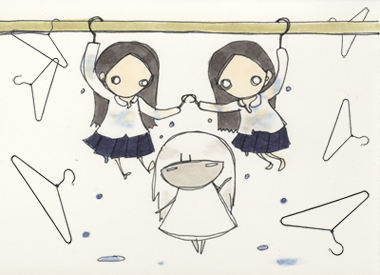 あるお昼過ぎにマリが家を出ると、物干竿に同じ顔をした女の子がふたりぶら下がっているのが見えました。彼女たちは双子で、人間の姿をしたハンガーです。ふたりは洗ったばかりでびしょ濡れの制服を着せられてぶら下がっています。マリが「さむくないの?」と訊くとふたりは口をそろえて「さむくないよ!」と言いました。「ハンガーなのだから、当たり前ね」と思い、マリは双子のハンガーに手を振って、街へ出掛けました。マリは『名曲が及ぼす影響』という本を買いに行くところだったのです。JUGEMテーマ:夢日記。