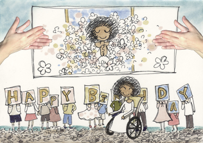 病気で入院している黒人の女の子がいました。彼女の身体は弱り切っていて車椅子無しでは動く事ができません。そんな彼女にはたくさんのお友達がいました。ある日、彼女のお友達全員は彼女を乗せた車椅子を押して彼女を外へ連れ出しました。向かった先には海がありました。大きな石がごろごろと転がる海辺に彼女を運びます。そして予め用意していた場所に車椅子を停めました。友達は海を背にして横にずらりと並び、彼女の方を向いて歌を歌い始めました。すると、お友達が並んでいる真上あたりの空中に、映像が浮かび上がりました...
