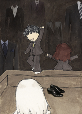 とても強い風の吹いている夜マリはどこかの屋上にいました。フェンスは無く周りを見渡しても夜景も建物も星も見えませんでした。周りにはスーツを着た大人たちが何人かいて雑談をしたりビルの下を見下ろしたりしていました。マリも下を見てみましたがとても高いビルなのか、下は真っ暗で地面が見えませんでした。その内、ひとりの男性が屋上のふちに立って笑顔でゆっくり、マリの方を見ながら飛び降りました。マリはしばらく、ぼんやりと先ほどまで男性がいた場所を眺めていました。他のヒトたちも笑顔で手を振って次々と飛び降り始め...
