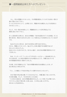 JUGEMテーマ:思想・啓発・哲学 始めまして、穂高登(仮名)と申します。 先人達が遺してくれた偉大な知恵、それが成功法則です。 所が、世の中には成功法則や自己啓発本を学んでいるのに 成功出来ない人がたくさんいます。 世の中に出回っている成功法則は「うそ」なのか? 肝心な所が隠されているのか? それとも自分の理解力が足りないのか...?。 このブログでは、私が成功法則を学んで感じた「素朴な疑問」 に対して、自分なりに検証を加え、 「どうすれば普通のサラリーマンが成功法則を活用出来るのか」 ...