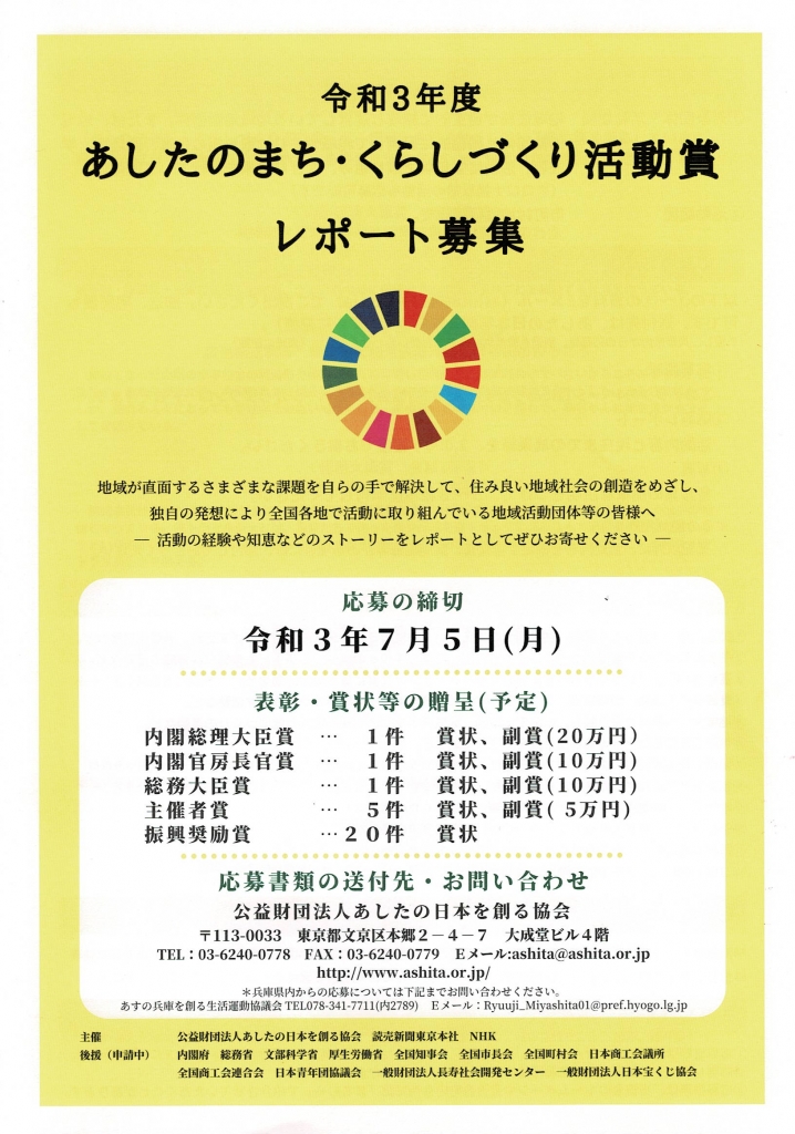 令和3年度あしたのまち・くらしづくり活動賞レポート募集 あしたの日本を創る協会、読売新聞東京本社、NHKが共催して実施しています。 入賞した団体の活動の様子は、読売新聞やNHKで紹介されます! 地域が直面するさまざまな課題を自らの手で解決して、住み良い地域社会の創造をめざし、 独自の発想により全国各地で活動に取り組んでいる地域活動団体等の皆様へ 〜活動の経験や知恵などのストーリーをレポートとしてぜひお寄せください〜 ◆表彰・賞状等の贈呈(予定) ●内...