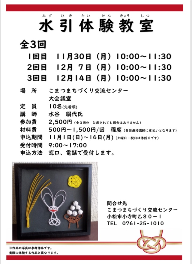 JUGEMテーマ:まちづくり 「水引体験教室」 こまつまちづくり交流センターでは3回にわたって、水引体験教室を開催します 場 所:こまつまちづくり交流センター 大会議室 定 員:10名(先着順) 参加費:2,500円(全3回分、欠席の場合にも返金はありません) 材料費:500円/回〜1500円/回 程度(各回講師に直接支払いとなります) 申込期間:11月1日(日)〜16日(月)(土曜・祝日は休館日です) 申込時間:9:00〜17:00 申込方法:窓口もしくは電話(25-1010)へ...