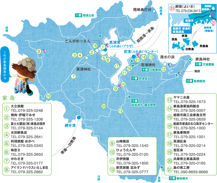 JUGEMテーマ:兵庫県 こちらは「どんがめっさん」(関西風に発音してください) 主人を待ち続けて石になってしまった亀さんです。 かなり大きいです・・・亀だったころからこの大きさだったのかしら?? どんがめっさんの近くにある?水田鮮魚店。 ↑自転車に乗っているのは、家島の地域おこし協力隊の渡邊さん。 運がよければ、冷蔵庫の中にある手づくりのお寿司にも出会えます。 渡邊さんのおすすめ! ...