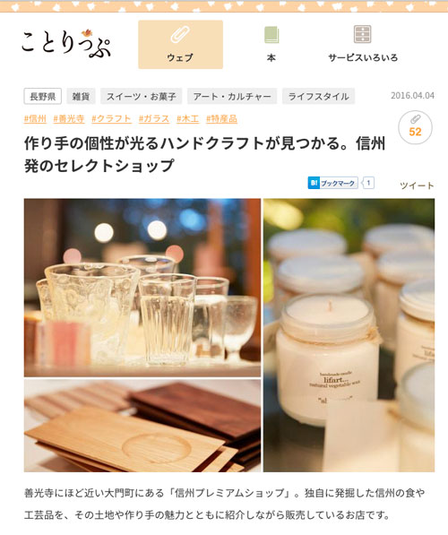 JUGEMテーマ:信州プレミアムショップブログ 旅と日常をつなぐWEBマガジン「ことりっぷ」に、当店の記事が掲載されました! ありがとうございます! 信州プレミアムでお取り扱いしている工芸作家さん達の作品を中心に紹介してくださっています。 ぜひごらんください。