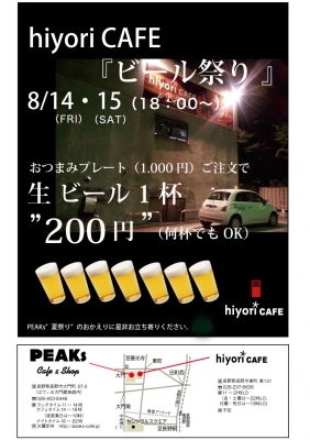 JUGEMテーマ:信州プレミアムショップブログ 明後日より信州プレミアムショップ前のスペースにて、 2階PEAKs Cafe主催の「PEAKs 夏祭り」を開催しますが、 PEAKs Cafe姉妹店のhiyori CAFEでも「ビール祭り」を開催予定です。 おつまみプレート(1,000円)をお一人様一つご注文していただくと、 なんと生ビールが一杯200円で飲めちゃうんです! 何杯ご注文いただいても、一杯200円でご注文いただけます。 PEAKs夏祭りを楽しんだ後、 暑い夏の夜をhiyori CAFEで美味しい生ビールとともに過ごしてみてはいかがですか。 ...