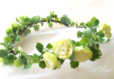 JUGEMテーマ:トワ・フルール日記 先日のデモンストレーションでご紹介しました ナチュラルなグリーン&ホワイトな花かんむりです。 こちらは、少しだけ白いミニバラをあしらって、 グリーンがつながる、つながるイメージです。 ウエディングで、こ〜きたら、 妄想ふくらむのは、 やっぱりエンパイアドレスでしょうか?(^^))かわいっ♪ そうそう、アーティフィシャルの花かんむりなら、 海外挙式にも持っていけますし便利で安心ですよね!