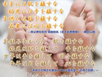 もう数年前のことになりますが、松平先生より教育談義の際に、 乳飲み子は肌を離すな 幼児は肌を離して手を離すな 少年は手を離して目を離すな 青年は目を離して心を離すな という言葉があるということを教えていただきました。 僕は、初めて聞く言葉だったのですが、シンプルながら見事に発達教育の要点を突いたテクストだと唸りました。 その時は、そのまま感じ入るだけで終わっていたのですが、最近になって、このテクストの原典は何なのだろうと調べてみましたところ、ご紹介...