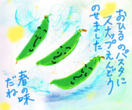スナップえんどう。(ときどきスナックえんどう という名前でも売っている)スナップえんどうは、茹でちゃあいけません♪バターで炒めて、塩こしょうする。シンプルなのが一番おすすめ!ポリポリと歯ごたえがあるのが好きですいつの間にか「ゆる絵」がたまっていたので、いくつか載せておきましょう。ほとんど、子ども絵ですね。フフフゆる絵でゆるゆる〜JUGEMテーマ:小さくて大切な幸せ。