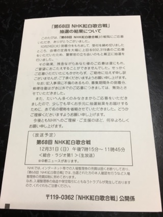 JUGEMテーマ:ひとりごちる NHKから返事きた。 紅白の閲覧、今年も見事にハズレ。 今回は出演者がわたしにとってはイマイチだったから、 別にショックではなかったけど、 多少の期待感も実はあったりして〜 今年もゆっくりと年の瀬を過ごします。