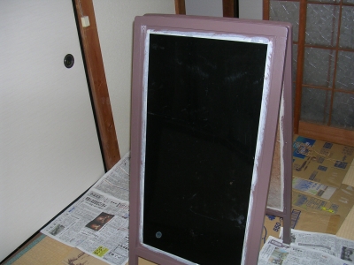 JUGEMテーマ:日常。 玄関のブラックボードの木枠の塗装が大分剥げてきたので 色の塗りなおし中。 本当は手間暇を考えると新しいのを買ったほうが 安くつくのだが自分の性分で直してしまう。