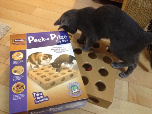 ねこ遊具を買いました. 日本では売っているところが分からなかったため,amazon.comに注文したところ19.99ドル.このおもちゃと猫トンネル(21.33ドル)を注文して+全体の送料が25.34ドルとなり,合計が66.66ドルでした.これらが2週間掛からず届きました. 紹介ページはこちら. “覗いてご褒美”的な名前です. ボールが2個付属しておりまして,それやら手持ちのチュー太郎を入れてやると取り出そうとして頑張る趣向です. JUGEMテーマ:日常。