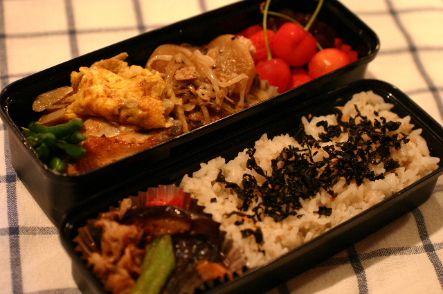 JUGEMテーマ:日常。 豚バラとオクラとナスとトマトのシナモン焼き いんげんのソテー 鶏手羽のハーブ焼き ごぼうのささがきの卵巻き 豚肉と大根ともやしの黒ゴマ炒め さくらんぽ、デラウェア、いちご 麦ごはん(鮭入り紫蘇わかめふりかけ) いつもclickありがとうございます! 3つのランキングサイトに参加しています♪ 上のリス君やバナーをclickしていただけると ランクが上がり励みになります♪