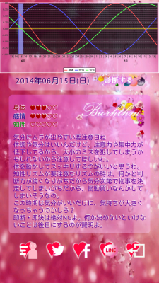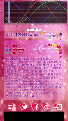 あぁ…またこの時期が来たか…という感じです。 体は元気ですが、心のエネルギーがEmpty(空っぽ)です。 何か軽く飲みにでも行ってストレス発散した方がいいのかな?と思うのは、感情リズムがMAXなせいでしょうか。 でも、バイオリズム女子部のコメントを見てると、それはやめておいた方が無難な感じがしますね。 体調を崩すと長引くタイプなので、体調管理に関する項目には敏感です。 貴女の素敵な毎日のために。 Android無料アプリ「バイオリズム女子部」 この時期は自分のケアに努めた方が...