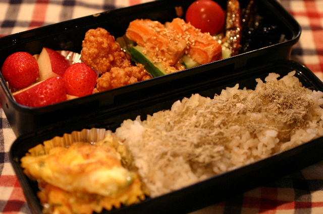 JUGEMテーマ:日常。 しそチーズ入り玉子焼き 黒豆、わかさぎの佃煮、プチトマト 人参とキュウリの胡麻ピーナツ和え 鶏の竜田揚げ りんご、いちご 麦ごはん(おぼろ昆布) いつもclickありがとうございます! 3つのランキングサイトに参加しています♪ 上のリス君やバナーをclickしていただけると ランクが上がり励みになります♪