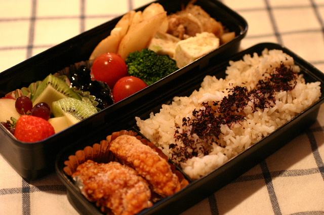 JUGEMテーマ:日常。 鶏の竜田揚げ 豚肉と大根ともやしの炒め煮 枝豆入り豆腐ハンバーグ 皮付きフライドポテト 茹でブロッコリー、プチトマト、黒豆 りんご、ぶどう、いちご、キウイ 麦ごはん(紫蘇ふりかけ) いつもclickありがとうございます! 3つのランキングサイトに参加しています♪ 上のリス君やバナーをclickしていただけると ランクが上がり励みになります♪
