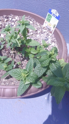 場所=お店の屋上 ミントがすくすく成長中〜 今日はとってもいいお天気で、かなり暑い。。。 お湯にならへんかなぁ。。。と悩みつつ、、、 これからこのミント達にお水をあげようと思います ミントがんばれー