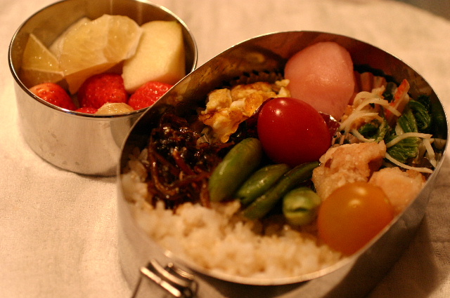JUGEMテーマ:日常。 アサリ入り玉子焼き 鶏もも肉の竜田揚げ カニカマとほうれん草のピーナツバター和え スナップエンドウのソテー カブの甘酢漬け イカナゴのくぎ煮 プチトマト(赤・黄) 玄米ご飯 きよみ(みかん)・ふじ(りんご)・さがほのか(苺) 今日は、なんとなく全部書いてみました♪ いつもclickありがとうございます! 3つのランキングサイトに参加しています♪ 上のリス君やバナーをclickしていただけると ランクが上がり励みになります♪