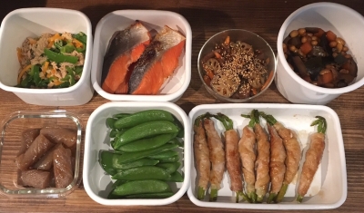 JUGEMテーマ:お弁当 今週のつくりおきおかずです。 【買った食材】 豚モモ薄切り 鮭 こんにゃく発表 板こんにゃく ピーマン レンコン ささがきごぼう(生協) ミニアスパラ(生協) 蒸し大豆 スナップエンドウ 人参 ピーマン 【4月1週目の作りおきおかず】 無限ピーマン 焼き鮭 こんにゃくの焼肉のたれ炒め きんぴらごぼう 五目豆 肉巻アスパラ 茹でスナップエンドウ 4日分なの...