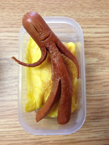ツイッターか何かで写真を見て、「これを作らねば」という謎の義務感に駆られました。後悔はしてません。 ヽ(╹◡╹*) < やぁ☆) 長めのソーセージしかなかったので、随分とスリムなソーセー人になってしまいました。しかも容器の長さが足りなくて曲げて入れたら面白いポーズになりました。