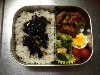 JUGEMテーマ:お弁当 今週1回目のお弁当は煮込みハンバーグからスタート☆ ハンバーグは先週焼いて冷凍しておいたものを朝から煮込みなおし、ピーマンを追加しました。 ちなみに煮込みには、ケチャップとお好み焼きソースを3対1でまぜたものをちゃちゃっとかけて炒めるだけの簡単レシピ。 十分おいしくいただけます♪ そうやってハンバーグをしている横で卵をゆで、小松菜のおひたしを作り、少し早めにお弁当作り終了! ゆとりをもって朝食作りもできました♪ ♪煮込みハンバーグwith...