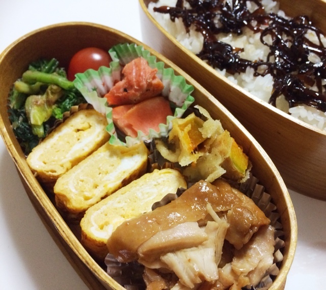 鶏の照り焼き 卵焼き ほうれん草おかか和え 焼き鮭 かぼちゃ天ぷら ミニトマト JUGEMテーマ:お弁当