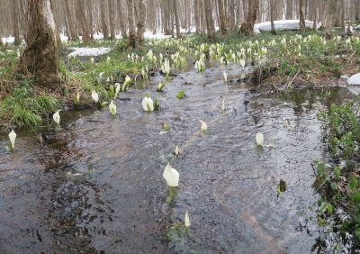 JUGEMテーマ:お花見&桜 国道46号線を田沢湖より角館方面に向かう途中に 水芭蕉の群生地がある。 駐車場から降りるとすぐに湿原が広がる ハンノキの林の遊歩道(木道)を歩くと可憐な水芭蕉 湿原の雪解け水が冷たそう 水芭蕉まつりは4月中旬からとのこと。 大きくなる前が見ごろかもしれない。H
