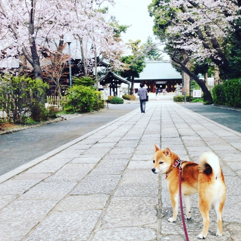 松陰神社の桜もほぼ満開。 - おまけ - 桜の写真を撮りたくて「ここでストップ」 「ちょっとオスワリ」と私がいちいち止めるもんだから スネ気味の寅さん。 わんこ 柴犬 お花見&桜