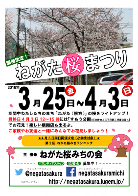 JUGEMテーマ:お花見&桜 東京都大田区・上池上自治会仲池地区に位置する桜並木のある遊歩道「ねがた桜みち」。 いよいよ「ねがた桜みち」が一番輝く、桜の季節が近づいてきました。 今年も2016年3月25日(金)〜4月3日(日)に 「ねがた桜みち」の桜並木ライトアップをおこないます。 ご家族やお友達と一緒にみんなでお花見しましょう! 最終日の2016年4月3日(日)12〜15時には 「ねがた桜まつり」を 「すもう公園(区立仲池上二丁目第二児童公園)」で 開催します。 今年も地元の商店自慢のメニューが勢ぞろい...