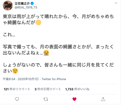 立花慎之介さん公式Twitter 声優の立花慎之介さんにお月見に誘われたので(笑) 早速お外に出て見てきた。 お月様は見えた。だけど、ここら辺は住宅密集地だもんで 電線やらよそんちの屋根やらで、あまり風情はなかった。 前の前に住んでいたビルなら屋上出入り自由だったので そこからきっと綺麗に見えたのになぁ。 今、そこは駐車場になっちゃったから(´・ω・`) 何年か前の皆既月食はめちゃくちゃ寒かったけどそこの 屋上で素晴らしい天体ショーを見せて...