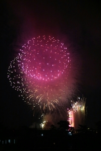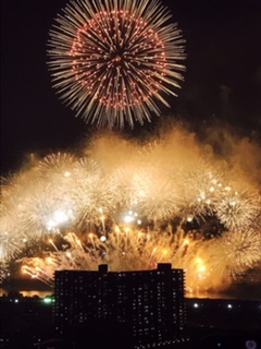 JUGEMテーマ:花火大会 連日猛暑が続いているので体調もダウン気味ですが、奮起! 毎年ウェスティンホテルのコーナースイートをお取りになる方にお誘いいただいて、 お邪魔して観賞させていただいています。 ポットラックパーティ形式で今年もたくさんの方にお会いでき、どん正面から見事な花火を1時間しっかり堪能させていただきました。日本の花火は散り消えゆく儚さがとても美しく心に残りますね...。