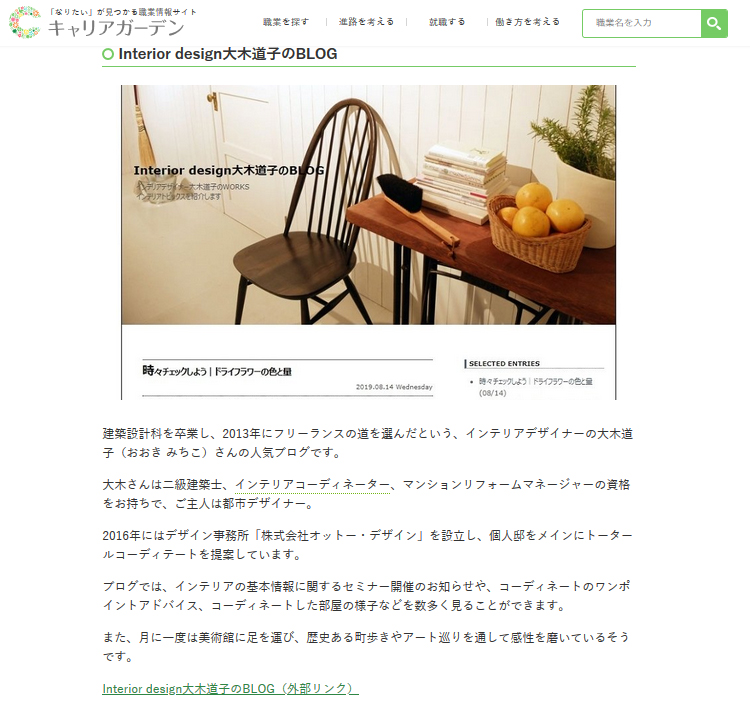 こんにちは インテリアデザイナー大木道子です 最近知りました キャリアガーデンという職業情報サイトに このブログと、私の紹介がされていました サイト側から連絡はいっさいありませんでしたが 内容に間違いもなく 丁寧に紹介頂いておりました ありがとうございます ただ、「インテリアデザイナーの仕事」のうち 著名な方の名前がすごかった 【インテリアデザイナーの有名な人】 ・剣持 勇(けんもち いさむ) ・松本 哲夫(ま...