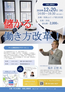 JUGEMテーマ:仕事のこと 和歌山で初開催!WLBC関西の講師による「儲かる働き方改革!」セミナーです。 中小企業経営者が今すべき、働き方改革とは?!経営を脅かす3大課題「人手不足」「就労継続」「人材育成」。これらを解決するための新しい手法を、 経営経験豊かな講師が、実際に則した具体的な事例を示して解説します。経営者にも、人事担当者にも、 悩み多き管理職にも「目から鱗」の新発見がいっぱいな講演会です。 ◆日時:12月20日(木)14:00〜16:30(受付13:30〜) ...