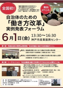 JUGEMテーマ:仕事のこと 私が所属しているWLBC関西が、「自治体のための働き方改革実例発表フォーラム」を開催します。企業の働き方改革だけではなく、最近では自治体や教師の働き方改革にも多くの関心が寄せられていますよね。 実際に自治体での働き方改革を実践してみたらどうなったのか、その事例発表と、関わった方々のトークセッションが行われる予定です。 自治体職員のみなさま、このような活動に興味のあるみなさま、ぜひご参加ください。 ■日時 6月1日金曜日 13...