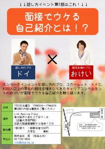 JUGEMテーマ:仕事のこと 明日7月5日木曜日、近畿大学東大阪キャンパス西門の真ん前で、トークイベントに飛び入り参加させていただくことになりました〜。 トークイベント第1部「面接でウケる自己紹介とは!?」で、スカーレット・ドイさんとウケる自己紹介談義を行います。私は学生の就活支援をしていますので、内容は学生さん寄りですが、社会人のみなさんも自己紹介って大事ですよね!自己分析にも役に立ち、印象に残る効果もある自己紹介ワークも行う予定です。 ...