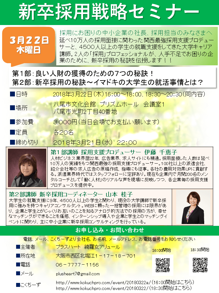 JUGEMテーマ:仕事のこと 採用にお困りの中小企業の社長、採用担当のみなさまへ こんなことにお悩みではありませんか? ・ナビサイトを使っても応募者が集まらない ・会社説明会をしても人が集まらない ・合同説明会に出店してもブースがさみしい ・会社にぴったり合った学生を採用できない ・内定を出しても辞退されてしまう ・今どきの学生が何を考えているのかわからない そのお悩み、ご一緒に解決しましょう! 第1部:良い人財の獲得のための7つの秘訣! 第2部:新卒...
