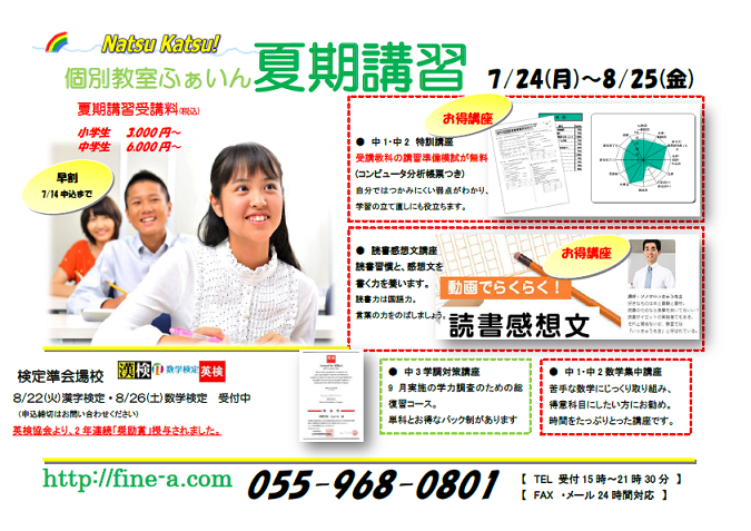 7/24(月)より8/25(土)まで夏期講習を行います。 小学生は新たに「ことばの学校読書感想文講座」が加わりました。 これは、読書感想文をらくらく書き、しかも、読書習慣までつけてしまおうという、大変欲張りな講座です。 中学生も英語と数学をとことん習得する講座をご用意しています。そして、中1と中2には、講習前のテストが無料。できないところが事前にわかるから、的を絞って学習できます。 お得なパック制と、早割あり。 JUGEMテーマ:勉強のこと