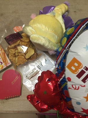 先週18歳の誕生日でした長女が、お友達から沢山のプレゼントを頂きました。 誕生日の次の日、高校は始業式でしたが台風で休校になってしまいました。 その風の強い日にクラスも部活も一緒の大の仲良しHちゃんが家までプレゼントを持って来てくれました!! 玄関を開けたら、「おめでと〜!!」とHappy Birthday と書かれている風船と芋好きの娘にスウィートポテト とラプンッエルのぬいぐるみを持ってきてくれました。 Hちゃんには、ご両親、叔母...