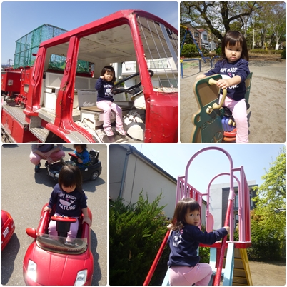 JUGEMテーマ:家族のこと ババ馬鹿を 楽しむ時に 感謝して ハ〜イ、灯里です! 続けてお祖母ちゃんのブログに登場です 今日もお祖母ちゃんとお留守番でしたが ようやく晴れたので一緒にお散歩 東京に引越して来てから初めて公園で遊びました(*^^)v 東調布公園の中にある児童交通公園です 最初に消防自動車の運転席に乗せて貰ったけど 固まっています 次々乗せて貰いましたが、表情硬いです ワンワンもたくさんお散歩していて 見ると「ワンワン!」と指差すんだけど 直ぐに「抱っと(こ)」と、お...