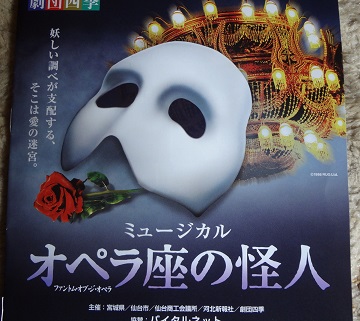 JUGEMテーマ:自分のこと ネタバレがあったらごめんなさい〜ご注意を〜 劇団四季「オペラ座の怪人」仙台公演が始まりました。 チケットを予約したのが7月。 ずっと前に仙台公演があると聞いてわくわく。そして,チケット購入をしてわくわく。街中のポスターを見てわくわく。テレビのCMを見てわくわく。わくわく少しずつ膨らんだ私でした。 いよいよ初日に出かけました。ミュージカル・歌舞伎大好きな母と行きました。 会場の入り口の柱も「オペラ座の怪人」仕様に模様替えされていて,わくわ...