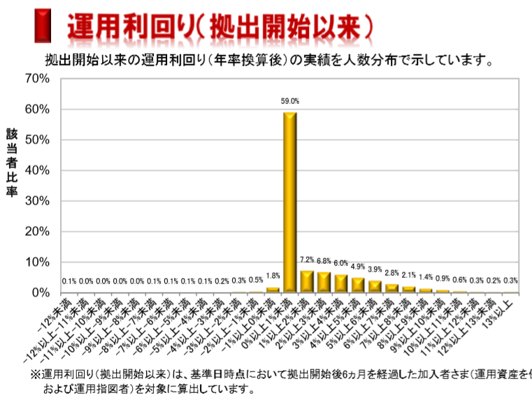 JUGEMテーマ:自分のこと 中央部分にスカイツリーよろしくそびえ立つ棒グラフ てっぺんの数字59.0%これが何を表しているのか。 私の勤める会社の企業型確定拠出年金(三菱UFJ信託銀行)の運用利回り云々 しかし、本当に表しているのは、運用していない人の割合ではないでしょうか。