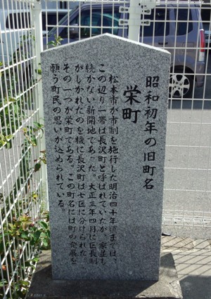 栄町の由来 松本市が市政を施行した明治四十年頃までは、この辺り一体が長沢町とよばれていたが、家並みも続かない新開地であった。 大正三年四月に区長制がしかれたのを機に長沢町は七区に分け られた。その一つが栄町である。この町名には町の発展を願う町民の願いが込められている。JUGEMテーマ:街