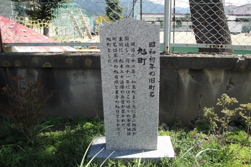 旭町の由来 明治二十二年、和泉町より北に第二線路が開通し、同四十一年にはこの通りの中原地区東側に、松本五十連帯の兵営が置かれた。町名は軍旗の旭日旗と東方の旭日とをかけて旭町とした。 旭町小学校西門前JUGEMテーマ:街