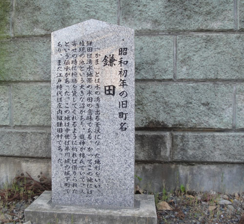 鎌田の由来「かま」とは水の湧き出る釜状になった地形をいい、鎌田は湧き水地帯の水田の意味である。かつてこの地には大きな沼があり、龍神が棲んでいて人寄せの時に椀膳を貸してくれるように祈れば、借りられたという伝承があった。この地は中世は井川城の城下町であり、また江戸時代は庄内組鎌田村であった。JUGEMテーマ:街
